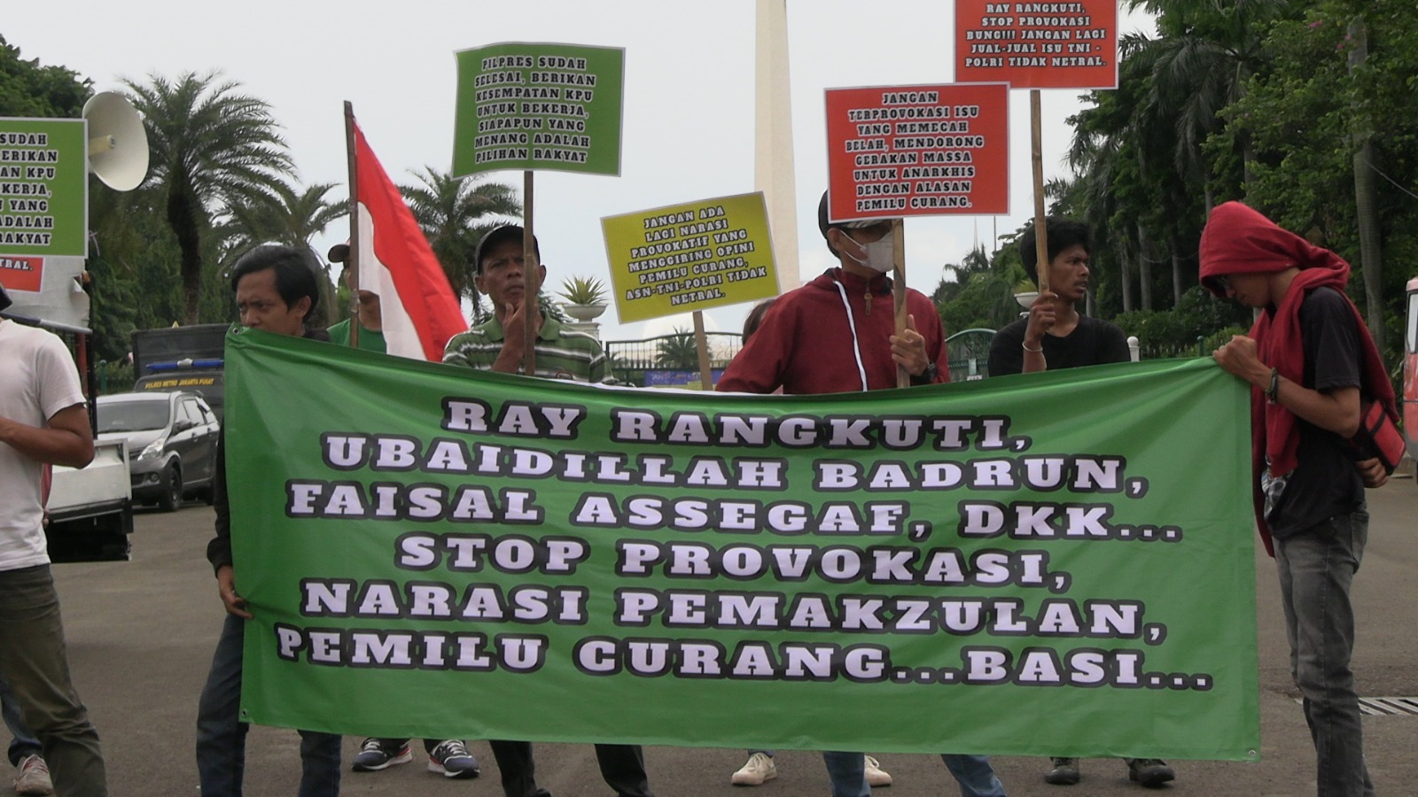 Disela-sela aksinya, para pendemo juga membawa alat peraga berupa spanduk dan poster yang bertuliskan yakni “Jangan ada lagi narasi provokatif yang menggiring opini Pemilu Curang, ASN-TNI-Polri Tidak Netral”, “Ray Rangkuti, Stop Provokasi Bung!!! Jangan Lagi Jual-Jual isu TNI – Polri tidak Netral”, “Dukung KPU Bekerja secara Independen, Dukung Siapapun Pilihan Rakyat”, “Mari Kita Terima Hasil Demokrasi dengan Lapang Dada, Menang & Kalah Hal Biasa dalam Demokrasi”, “Ray Rangkuti, Ubaidillah Badrun, Faisal Assegaf, dkk Stop Provokasi, Narasi Pemakzulan, Pemilu Curang.. Basi”.